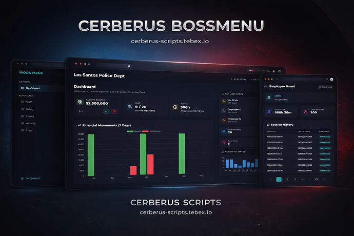 CERBERUS Boss Menu is a full-featured organization management resource for FiveM roleplay servers. It covers the entire administrative lifecycle of your in-game jobs: managing staff, handling finances, tracking working hours, collecting data through custom forms, and monitoring activity through a built-in analytics dashboard. It’s built with a modular bridge architecture, so it works out of the box with QBX, QBCore, and ESX Legacy — and can be extended for custom setups.