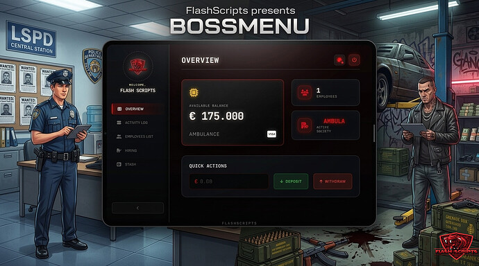 Tired of clunky and insecure boss menus? Flash Boss Menu offers a premium solution for managing organizations on your FiveM server. This resource provides a modern user experience with a premium tablet aesthetic, excellent optimization, and robust server-side security.