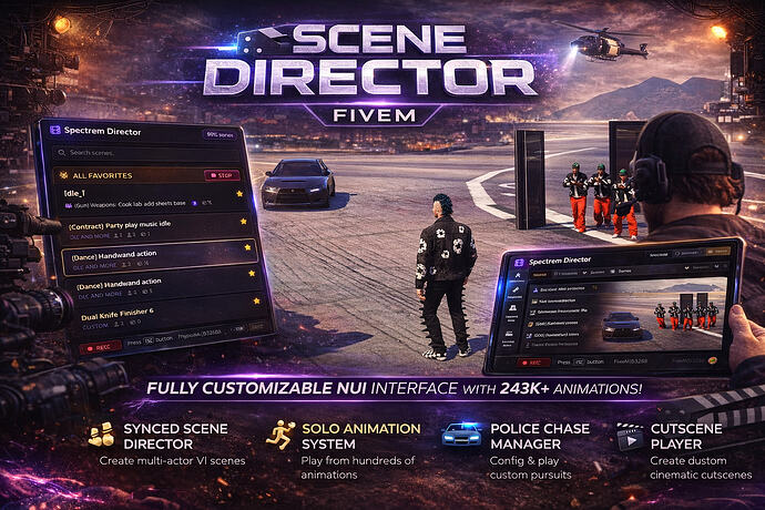 Take full control of your server’s cinematic experience with Spectrem Director, an all-in-one director suite made for FiveM servers that want more advanced cinematic tools, synced scenes, animation control, environment management, and immersive scene creation from a sleek in-game UI. Spectrem Director allows you to create, place, and play synchronized multi-actor scenes, solo animations, police chases, cutscenes, and even control weather, time, and population density in real-time.