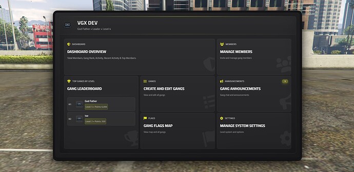Elevate your QBCore FiveM server with the VGX GangSystem, a modern and powerful gang management and territory control system. This comprehensive system is designed to foster competitive gang gameplay through an advanced tablet interface, robust gang management tools, and a fully integrated flag territory system.