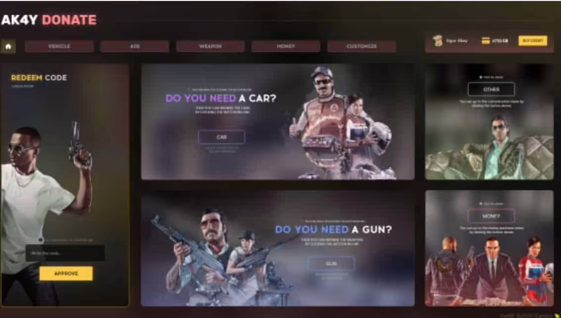 Organize shop categories logically: Vehicles (cars, bikes, boats, aircraft), Weapons (pistols, rifles, rare firearms), Items (consumables, tools, drugs), Money (buy in-game cash), Perks (gameplay advantages), Cosmetics (appearance items), Bundles (value packages). Clear categorization improves user experience and increases purchase rates through easy navigation.